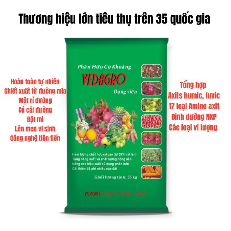 Thành phần: Đạm 9% K20 4,5% 55% hữu cơ Còn lại là axit humic, fuvic, amino, vi lượng ... thích hợp dòng cây chất lượng cao đòi hỏi yêu cây khét khe về phân bón, tan tốt, không lẫn tạp chất, an toàn trong nông nghiệp hữu cơ. Đặc tính sản phẩm √√√ Cải thiện tính toán của đất, tăng sản lượng, cung cấp nguồn dinh dưỡng phong phủ, sản phẩm được tiêu thụ nhiều quốc gia trên thế giới. √ Sản phẩm đạt được nhiều giải thưởng và chứng nhận 1. Cải thiện tính toán của đất: hỗ trợ phát triển bộ cất, giữ nước, giữ phân tích, tăng lượng vi sinh vật có lợi trong đất, duy trì cấu trúc xốp của đất. 2. Bổ sung dưỡng chất có lợi cho cây trồng: gồm 17loại axit amin, axit humic, axit fuvic, vitamin, protein, chất sinh trưởng và nguồn dinh dưỡng phong phú, 3. Tiêu thụ trên 35 quốc gia như: Mỹ, Nhật, Ý, Trung Quốc , An Độ ... √√√ Được trao tặng: Top thương hiệu vàng của nông nghiệp Việt Nam năm 2016-2017, sản phẩm chất lượng cho mùa bội thu năm 2017 và chứng nhận sản phẩm của năm 2014-2016, chứng nhận ISO 9001. √√√√ Vedagro có nguồn gốc hoàn toàn tự nhiên từ mật của đường, tinh bột mì, chiết xuất từ cây củ cải. Đồng thời sử dụng công nghệ lên men tiên tiến từ Đài Loan, tạo ra dòng sản phẩm chủ sở hữu với hàm lượng axit amin cao. VEDAGRO được sử dụng cho hầu hết các loại cây trồng, thích hợp sử dụng trong giai đoạn lót và kết thúc, phù hợp với nền nông nghiệp xanh.
