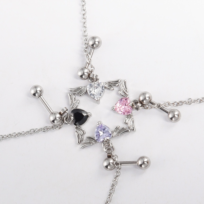Mô tả: Tên: Mặt dây chuyền hoa tai đinh tán hình trái tim thiên thần Chất liệu: hợp kim + đá quý nhân tạo Kích thước: 6cm Màu: tím, đen, trắng, hồng Dành cho: Phụ nữ Phong cách: Hàn Quốc Công nghệ chế biến: inlay Thể loại: hoa tai Hình dạng: hình trái tim, cánh Số lượng: 1