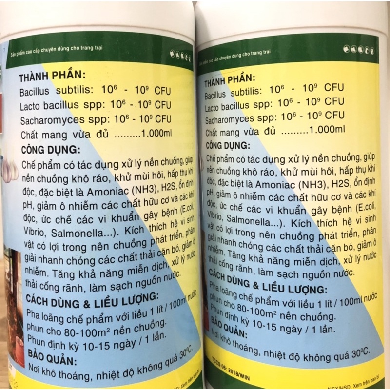 THÀNH PHẦN Bacillus Subtilis: 106-109 CFU Lacto bacillus spp: 106-109 CFU Sacharomyces spp: 106-109 CFU Chất mang vừa đủ: 1.000 ml. CÔNG DỤNG Chế phẩm có tác dụng xử lý nền chuồng, giúp nền chuồng khô ráo. Khử mùi hôi, hấp thụ khí độc nhất là Amoniac, H2S, ổn định pH, giảm ô nhiễm các chất hữu cơ và các khí độc, ức chế các vi khuẩn gây bệnh (E. coli, Salmonella,…). Kích thích hệ vi sinh vật có lợi trong nền chuồng phát triển, phân giải nhanh chóng các chất thải cặn bã, giảm ô nhiễm. Tăng khả năng miễn dịch, xử lý nước thải cống rãnh. Làm sạch nguồn nước. CÁCH DÙNG: Pha loãng sản phẩm với liều: 1 lít/ 100 lít nước phun cho 80-100m2 nền chuồng. Phun định kỳ 10-15 ngày/ 1 lần QUY CÁCH: 1 Lít GIÁ: 130.000 đồng TCCS 06: 2018/WIN