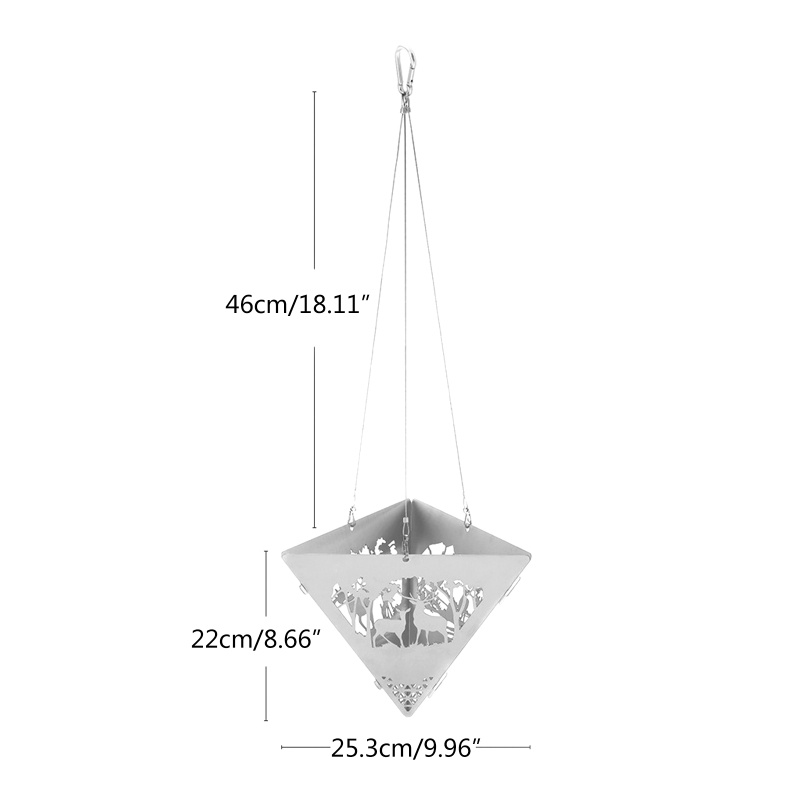 Đặc điểm: Tay nghề cao và độ bền giúp không dễ biến dạng, không dễ rỉ sét và chắc chắn. Đường cắt tinh tế, hoa văn đẹp mắt và tính năng có thể treo được làm cho nó thiết thực và thuận tiện khi sử dụng. Được làm bằng chất liệu thép không gỉ, sản phẩm chống mài mòn và chống ăn mòn. Thiết kế có thể tháo rời, dễ dàng cất giữ, tiện lợi và nhanh chóng. Nó thích hợp cho cắm trại ngoài trời, đi bộ đường dài, v.v. Chỉ dành cho Lò treo Tam giác, không bao gồm các phụ kiện demo khác trong hình!