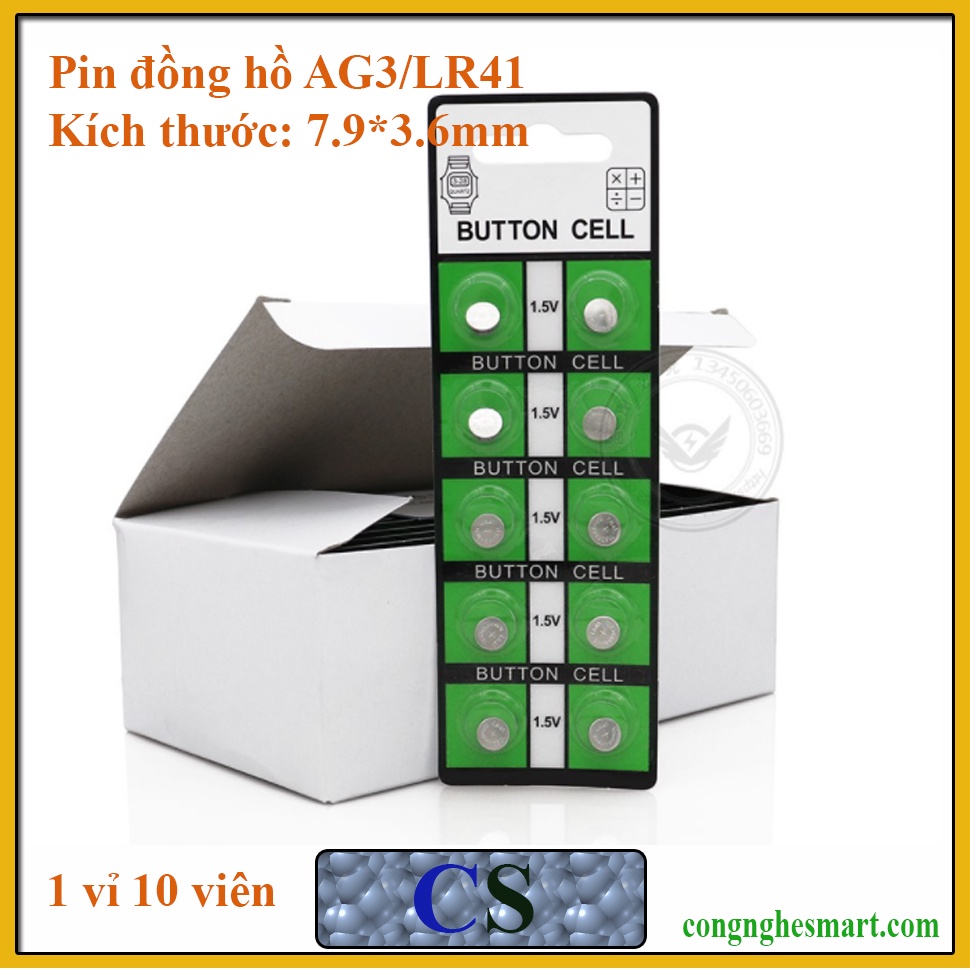 Giá bán là 1 vỉ 10 viên Pin cúc áo tên gọi khác là: Pin nút, AG3, LR41, SR41, 392, 192 Loại pin : Pin AlkalineVolts : 1.55V Điện áp: 1.55V Kích thước : đường kính 7.9mm x 3.6mm Pin cúc áo AG3 / LR41 sử dụng cho: đồng hồ điện tử, các thiết bị điện, điện tử, đồ chơi v,v... Tình trạng đóng gói 10 viên trên 1 vỉ Pin an toàn không chứa thủy ngân.