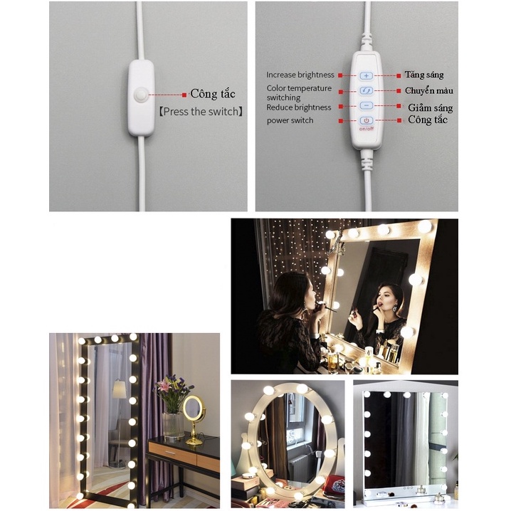 Giới thiệu Bộ 10 Bóng Đèn Led Gắn Gương Đổi Màu, Tăng Giảm Ánh Sáng 5 Chế Độ, Đèn Led Dán Gương Điều Chỉnh Nhiều Màu