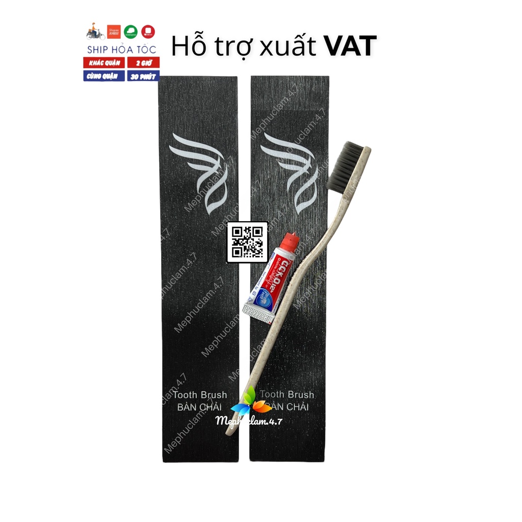 Giới thiệu 100 bàn chải lúa mạch than hoạt tính cán thẳng mẫu 01 bao bì cánh chim hoàng kim cho khách sạn, resort, homestay, villa