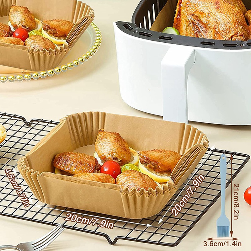 Gói hàng bao gồm: 100 x giấy chiên không khí 1 x Bàn chải dầu Chỉ nội dung gói trên, các sản phẩm khác không được bao gồm. Lưu ý: Ánh sáng phản chiếu và cách hiển thị khác nhau có thể khiến màu sắc của vật phẩm trong hình hơi khác so với hàng thật. Sai số cho phép đo là +/- 1-3cm.