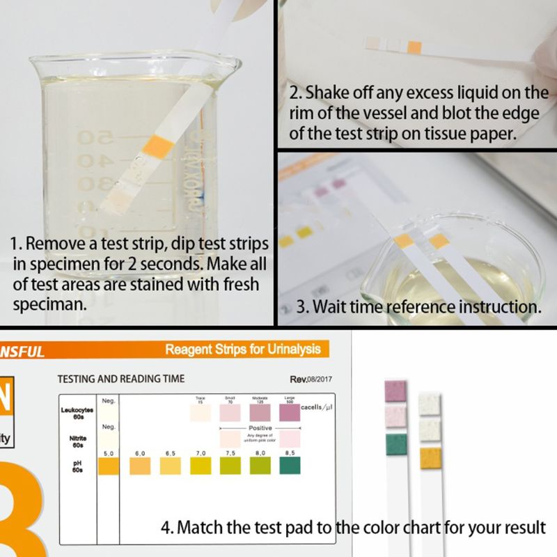 Cách sử dụng ' 1.Tháo một dải và giữ đầu không màu 2.Đặt đầu dải màu vào giữa dòng nước tiểu hoặc vào cốc mẫu trong 1-2 giây 3.Lau sạch nước tiểu thừa và đợi chính xác cần thiết để có thời gian thay đổi màu sắc 4.So sánh kết quả que thử với bảng màu