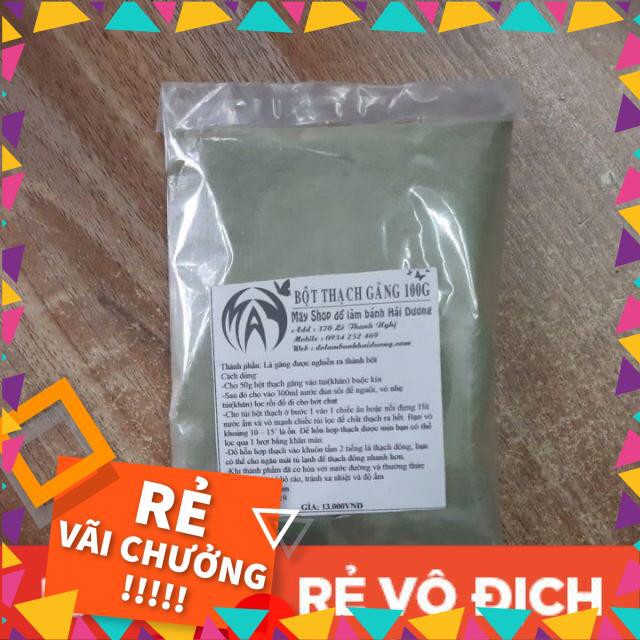 Bột thạch găng 100% nguyên chất Thạch lá găng có tác dụng giải nhiệt, thanh lọc cơ thể, chống sỏi thận... Shop có gửi tặng hướng dẫn cách làm . 100g bột thạch lá găng có thể làm được 7-8 lít thạch. Bí quyết để thạch giòn hơn: sau khi vò , ta cho 1 chút nước vôi trong Bí quyết để thạch nhanh đông: dùng nước ấm 30-40 độ. Xuất xứ: Việt Nam Hạn sử dụng : 1 năm