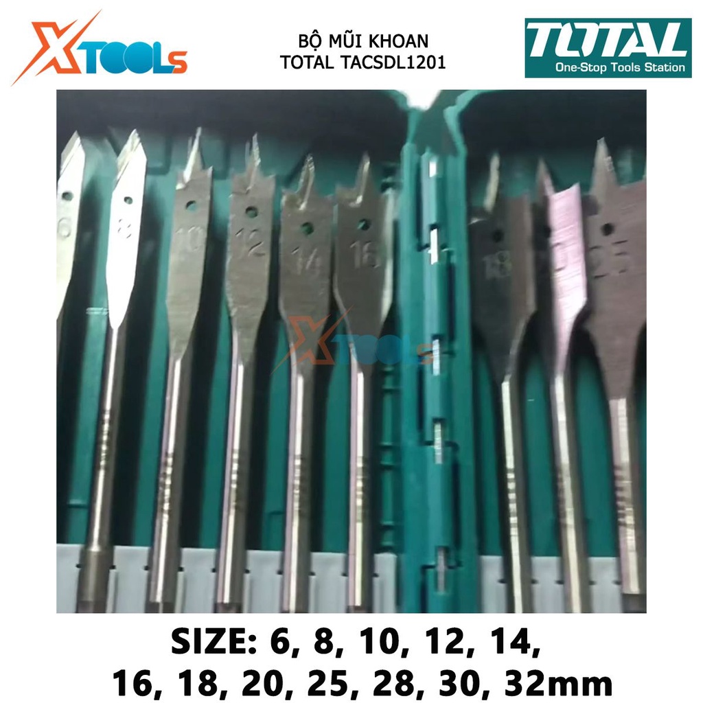 Dụng cụ và thiết bị tiện ích > Dụng cụ cầm tay > Máy khoan, máy vặn vít & phụ kiện > Bộ 12 mũi khoan gỗ đầu dẹp TOTAL TACSDL1201 bộ 12 mũi khoét gỗ đuôi cá Đuôi lục giác 1/4 ", Chiều dài 152mm, Size 6,8,10
