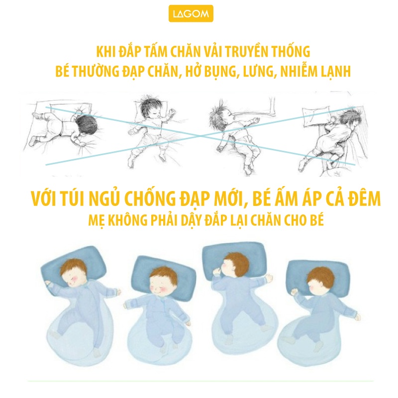 Khi thời tiết trở lạnh không ít ba mẹ lo lắng việc con thường xuyên đạp tung chăn khi ngủ, dễ khiến bé bị nhiễm lạnh dẫn đến các bệnh viêm đường hô hấp trên. Hiểu được điều này, LAGOM đem đến cho ba mẹ sản phẩm túi ngủ trẻ em chống đạp, là sản phẩm thay thế hoàn hảo cho chiếc chăn đắp truyền thống.