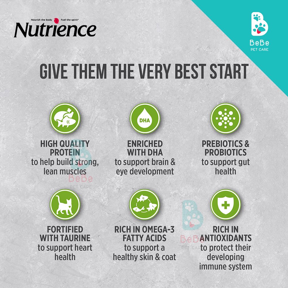 ƯU ĐIỂM: - Phát triển cơ bắp khỏe mạnh: mèo con đòi hỏi nhiều protein hơn trong chế độ ăn. Chúng tôi sử dụng bột thịt gà chất lượng cao làm thành phần chủ yếu và không sử dụng các phụ phẩm từ động vật (meat by-product) hoặc đạm thực vật, để đảm bảo cho mèo con của bạn phát triển cơ bắp chắc khỏe. - Hệ tiêu hóa khỏe mạnh: sức khỏe tiêu hóa liên quan trực tiếp đến sức khỏe tổng thể của thú cưng. Công thức của chúng tôi bao gồm sự kết hợp của ngũ cốc nguyên hạt (gạo lứt), chất xơ tự nhiên và chất xơ hòa tan (prebiotic) để giúp mèo con của bạn duy trì đường ruột khỏe mạnh. - Phát triển nhận thức: dầu hạt lanh và dầu cá hồi là nguồn DHA tự nhiên đóng một vai trò quan trọng trong sự phát triển của não và hệ thần kinh của mèo con. Chúng tôi đảm bảo mức độ thích hợp trong mỗi túi thức ăn nhằm hỗ trợ phát triển trí não giúp mèo con của bạn thông minh hơn. - Da và lông khỏe mạnh: các axit béo omega-3 cũng như axit béo omega-6 có nguồn gốc từ đất (hạt lanh) và biển (dầu cá hồi) cung cấp cho mèo con của bạn một tỷ lệ chất béo lành mạnh cân bằng và đa dạng hơn để giúp da phát triển khỏe mạnh và lớp lông bóng mượt. - Hệ miễn dịch khỏe mạnh: sử dụng nhiều nguồn nguyên liệu tự nhiên có chứa chất chống oxy hóa cho các công thức dinh dưỡng Nutrience (quả việt quất, nam việt quất và cà rốt cùng với vitamin C, vitamin E và taurine) để chúng hoạt động cùng nhau hỗ trợ hệ thống miễn dịch đang phát triển của mèo con.