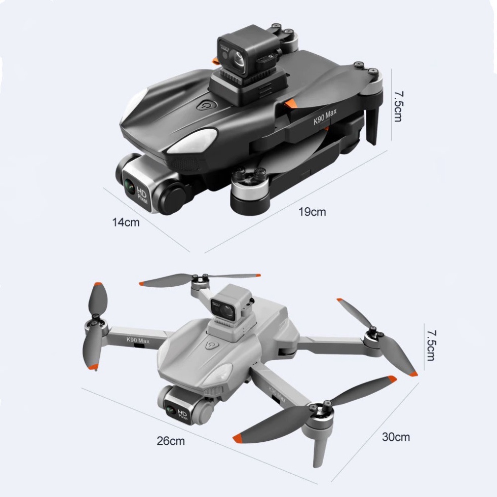 Đặc Điểm Nổi Bật: - Flycam K90 Max có một kiểu dáng thiết kế nhỏ gọn và khá giống với mẫu flycam cao cấp như Mini 2. - Thiết kế gấp gọn tiện lợi vô cùng và dễ cầm dễ chơi. - Camera có độ phân giản 4K, góc nhìn camera : 110 độ - Đông cơ không chổi than nên độ bền khá là ổn - Ngoài trang bị GPS còn có cảm biến độ cao giúp ta bay ổn định thấp hơn, giữ vị trí rất là tốt. - Dung lượng pin: 3000mha bay trong khoảng thời gian 22 - 25 phút - Màu sắc của sản phẩm là màu trắng hoặc đen. - Điểm nhấn trong thiết kế của máy là cụm cảm biến phát hiện vật thể được gắn ở phía trên thân máy đem đến khả năng phát hiện những vật cản ở xung quanh máy trong phạm vi 3 - 5 mét giúp cho nó có thể đứng lại khi đang bay, đảm bảo hơn sự an toàn, đặc biệt là đối với những ai mới bắt đầu chơi flycam. - Kích thước: 30 x 26 x 7.5 cm - Trọng lượng: 350 gram