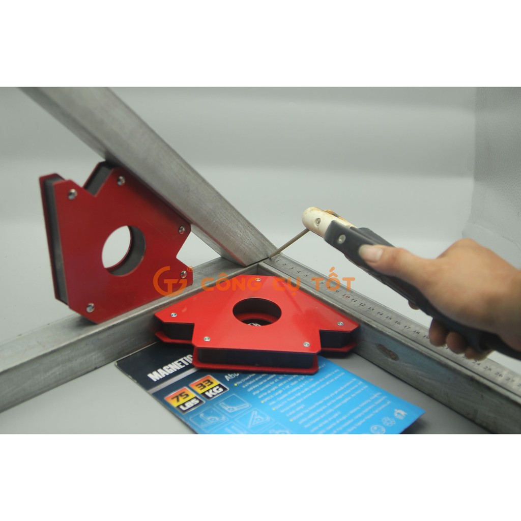 1. Đặc tính nổi bật -Nam châm ke góc vuông là loại ke vuông từ với lực hút 33kg -Nam châm nặng hơn 1kg và có lực hút mạnh có thể ke được góc 45°, 90°, 135° -Ke góc có lỗ cầm chắc chắn -Với bộ 2 ke góc, thợ hàn tăng tính tự chủ khi một mình có thể thao tác để hoàn thành công việc khó -Phù hợp với các loại thép dân dụng, thép hình thép hộp 2. Mô tả sản phẩm Bộ 2 ke góc nam châm dành cho thợ hàn lực hút đến 33kg mỗi chiếc chuyên dụng để cố định các góc lớn, rất thuận tiện khi hàn khung thép hộp to Bộ 2 ke nam châm thợ hàn 75lbs lực hút 33kg thuộc loại lớn, được cấu tạo chủ yếu từ nam châm vĩnh cửu, với hình dạng gần giống một tam giác cân có thể giúp thợ hàn cố định các góc vuông và góc nhọn. Sau khi cố định người thợ hàn thoải mái thao tác hàn, tăng tính tự chủ hơn. 3. Thông số kỹ thuật -Chất liệu : nam châm vĩnh cửu -Vỏ sắt mạ tĩnh điện -Chiều dài các cạnh tiếp xúc: 11cm -Đường kính lỗ cầm tay: 46cm