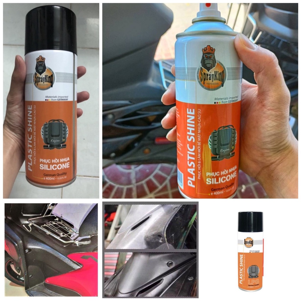 sản phẩm 100% từ đức ( made in garmany) ***SPRAYKING CHAIN CLEAN: rửa sên - Rửa sạch vết dơ bẩn của dầu mỡ, đất cát bám trên nhông sên dĩa. - Đặc biệt không ảnh hưởng đến phốt cao su của sên. ***SPRAYKING CHAIN LUBE: dưỡng sên - Công dụng bôi trơn, giảm hao mòn, tăng tuổi thọ sên. - Giúp sên vận hành êm ái trên mọi nẻo đường. - Giúp giảm chi phí bảo dưỡng cho xe của bạn *** SPRAYKING PLACTIC SHINE: dưỡng nhựa nhám Chai xịt đánh bóng nhựa đen, bóng vỏ, đồ nhựa SPRAYKING 400ml Dàn áo bạn đi lâu ngày bị sỉn màu, xuống cấp Bạn đừng lo, chai phục hồi nhựa nhám sẽ giúp bạn điều này, tiết kiệm thời gian, dàn áo như mới Chai xịt nhựa nhám này với chất keo + silicone bên trong sẽ giúp bề bám vào bề mặt, tạo hiệu ứng cánh sen , nước không bám được Phục hồi nhựa nhám làm đen lại nhựa màu đen Xoá đc xướt lông mèo Xịt đều lên bề mặt cần làm mới sau đó lau lại bằng khăn khô