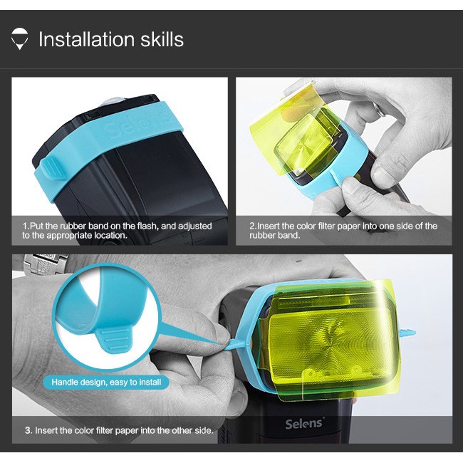 Lưu ý: Chu vi đầu của đèn flash phải lớn hơn 17,9cm (7,05 inch), nếu không, đai cao su sẽ không cố định tốt các gel màu cho đèn flash.