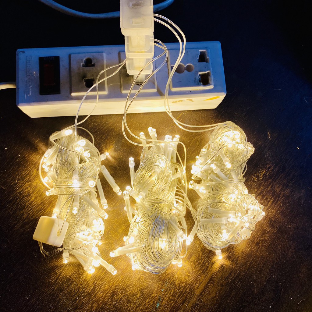 MÔ TẢ SẢN PHẨM: - Quy cách đóng gói: 03 dây đèn led, mỗi dây dài 8 mét. - Độ dài: 8 mét 50 bóng/dây. Bóng có đường kính 0,5cm và dài bóng 3cm. - Màu sắc: màu vàng nắng, không nhấp nháy - Nguồn điện: 220 v - Có phích cắm nối chồng giữa các dây (xem ảnh) - Dây dẫn bằng chất liệu nhựa trong suốt