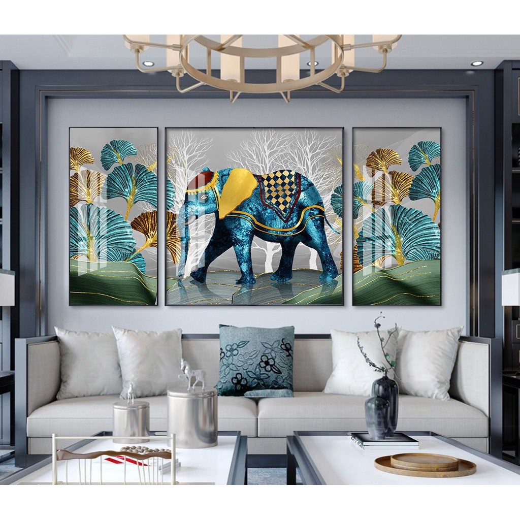 Bộ 3 Tranh Treo Tường Con Voi Tranh Phong Thuỷ- Cao Cấp Vải Canvas Kim Tuyến Tranh Tráng Gương 3D - Melyhome