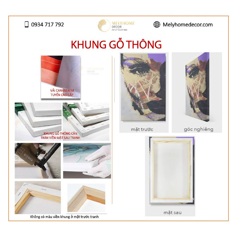 - Tranh Khung gỗ thông căn tràn viền trên bề mặt vải canvas kim tuyến cao cấp, mặt trước không thấy viền khung nhưng tuỳ mẫu shop sẽ in viền đen lên trực tiếp vải canvas để nhìn hiệu ứng có viền khung mặt trước tranh giúp khách hàng tiết kiệm. Độ bền 5-7 năm