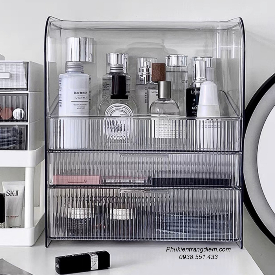 - Sản phẩm Kệ Tủ Đựng Đồ Trang Điểm Trong Suốt 3 Tầng Có Nắp là mẫu hộp đựng đồ make up được khách hàng yêu thích và tìm kiếm nhiều nhất trên thị trường, tủ để mỹ phẩm với chất liệu trong suốt đẹp mắt, thiết kế hình khối không chiếm nhiều diện tích không gian và phù hợp với mọi góc trang điểm của quý khách.