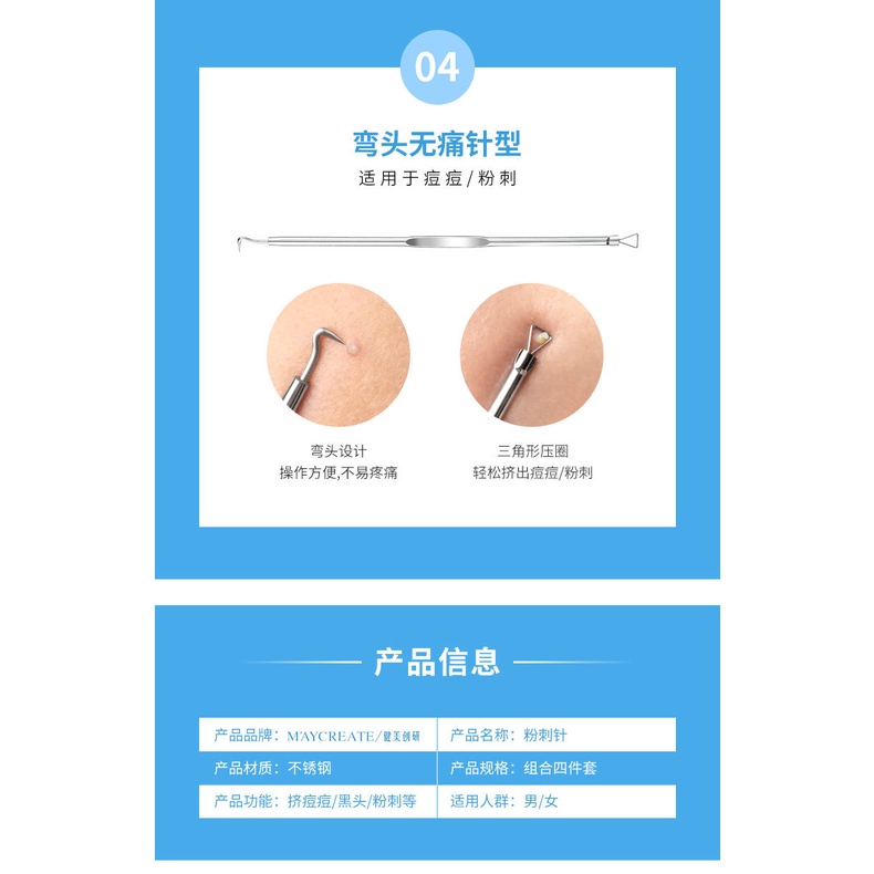 Hướng dẫn sử dụng Cây Nặn Mụn Maycreate: B1: Vệ sinh đầu kim cần sử dụng B2: Vệ sinh khu vực da B3: Dùng kim chọc nhân mụn, trứng cá B4: Dùng dụng cụ nặn mụn B5: Vệ sinh da sau sử dụng B6: Cất các dụng cụ về nơi bảo quản