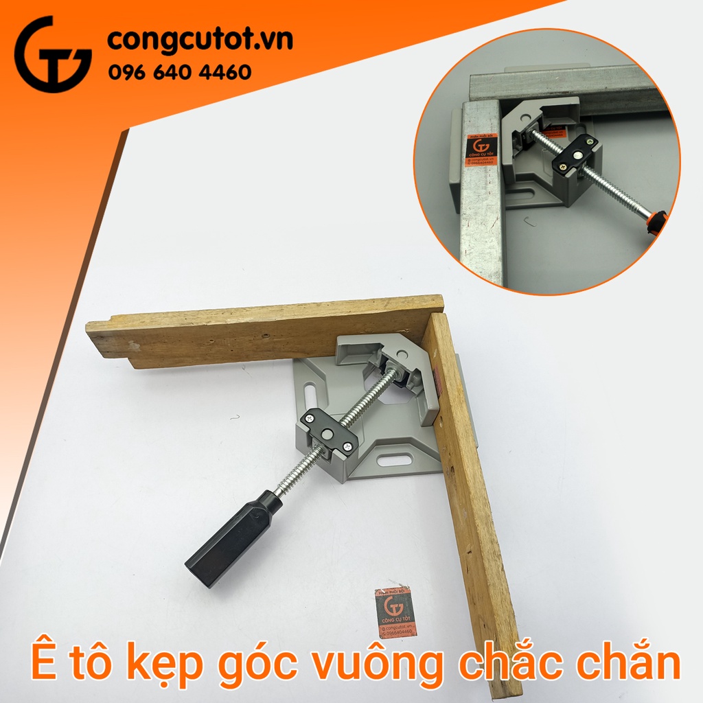 Công dụng của Ê tô góc vuông 1 tay cầm : Kẹp gỗ góc vuông là công cụ không thể thiếu trong công việc sản xuất đồ gỗ nội thất, bàn ghế, giường tủ... Sử dụng rộng rãi trong công việc khoan, đóng đinh, bắt vít góc vuông cần độ chính xác cao Là dụng cụ vô cùng quan trọng khi sản xuất khung tranh Trong cơ khí, chi tiết góc vuông cần hàn góc hay bắn keo thì đây là công cụ không thể thiếuNgoài ra ê tô còn được sử dụng sản xuất bể cá kính Là loại ê tô góc ngoài nên mỗi bên ê tô được sử dụng như 1 chiếc ê tô bàn kẹp thẳng gia công (khoan, mài, đánh bóng...) chi tiết nhỏ, cần độ chính xác cao Kẹp được nhiều loại vật liệu như : gỗ, nhôm, sắt, nhựa, kính...
