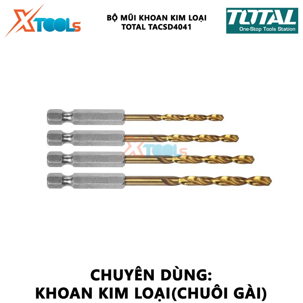 Dụng cụ và thiết bị tiện ích > Dụng cụ cầm tay > Máy khoan, máy vặn vít & phụ kiện > Bộ 4 mũi khoan kim loại kim đuôi lục giác TOTAL TACSD4041 Combo 4 mũi khoan đuôi gài Gồm 4 size, Đuôi lục giác 1/4", thé