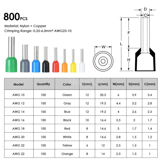 Specification: AWG 10 (Green) : F : 12mm L : 20.5mm W : 6mm D : 3.9mm C : 3.4mm AWG 12 (Gray) : F : 12mm L : 19.5mm W : 4.4mmD : 3.2mmC : 2.8mm AWG 14 (Blue) : F : 12mm L : 19.2mmW : 4mm D : 2.6mm C : 2.3mm AWG 16 (Black) : F : 10mm L : 16.4mm W : 3.5mm D : 2mm C : 1.7mm AWG 18 (Red) : F : 8mm L : 14.6mm W : 3mm D : 1.7mm C : 1.4mm AWG 20 (White) : F : 8mm L : 14.6mmW : 2.8mmD : 1.5mmC : 1.2mm AWG 22 (yellow) : F : 6mm L : 12mm W : 2.5mm D : 1.3mmC : 1mm AWG 22 (Orange) : F : 8mm L : 14mmW : 2.5mm D : 1.3mm C : 1mm