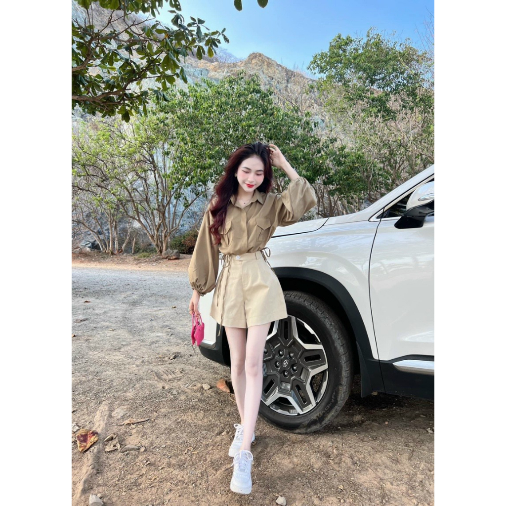 Giới thiệu [5,5 Sales Freeship] Set váy tiểu thư nữ thanh lịch, set áo sơ mi tay phồng đắp túi rút eo mix quần short đùi màu nu dx