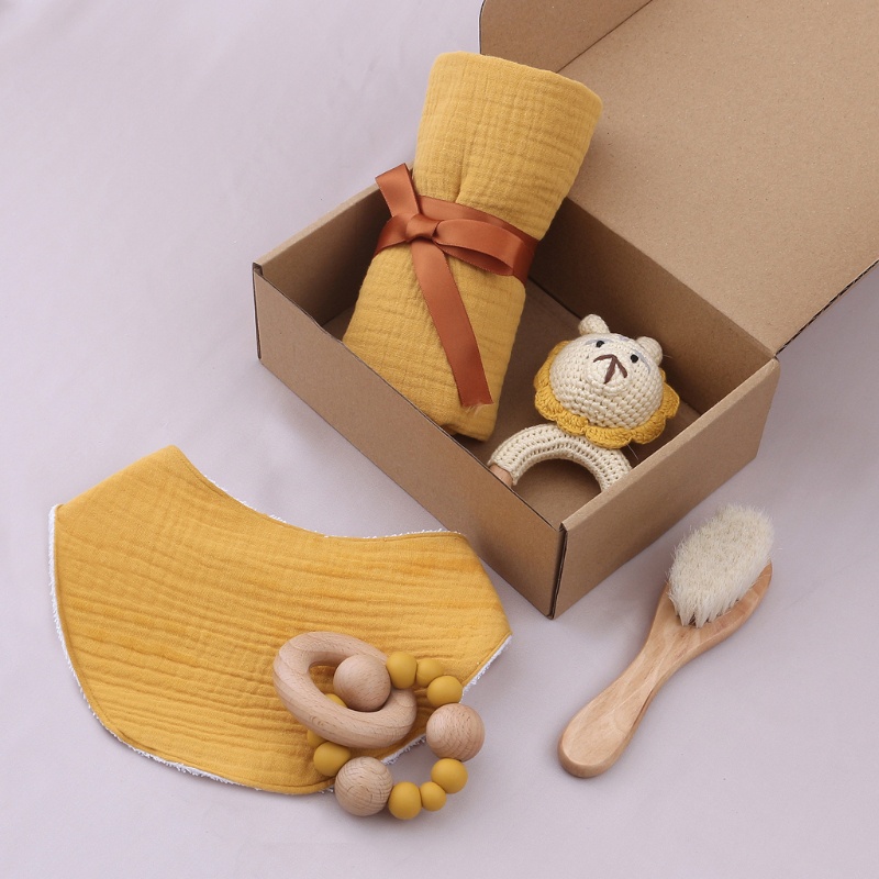 Nội dung gói hàng ' 1 x Yếm tam giác cho bé 1 x Khăn mặt rửa hình chữ nhật cho bé 1 x Bàn chải tóc cho trẻ sơ sinh 1 x Lục lạc móc cho bé 1 x Vòng đeo tay cho bé
