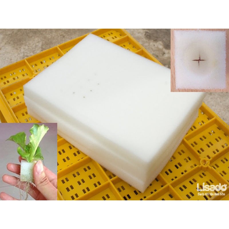 Mút xốp ươm hạt là một trong những loại giá thể trồng thủy canh phổ biến với các ưu điểm vượt trội sau: -Môi trường gieo trồng sạch bệnh 100% -Độ thông thoáng cực tốt, không lo úng rễ con -Dễ dàng đưa cả viên xốp có cây con lên giàn thủy canh vô cùng tiện lợi -Hút nước mạnh, giữ ẩm tốt cho cây -Tiện lợi gọn nhẹ, xé nhỏ ra tùy nhu cầu -Có thể tái sử dụng 2-3 lần tùy loại cây (nếu bị rêu xanh nhiều nên thay mới tránh mầm bệnh) Một nhược điểm so với gieo bằng viên nén xơ dừa cần lưu ý là mút xốp không có sẵn dinh dưỡng nên cần pha dinh dưỡng thủy canh tưới cho cây con (pha loãng khoảng 300-400ppm).\\