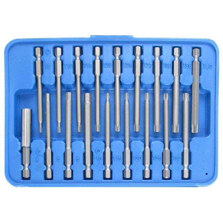 Bộ mũi vặn vít đa năng * Thông tin sản phẩm: Gồm 50 chi tiết dài 75mm + 1 đầu nối tô vít dài 60mm trục 6.35mm + 14 mũi tô vít hoa thị ( T8 - T10 - T15 - T20 - T25 -T27 - T30 - T35 - T40 ) + 3 mũi đầu vít lục giác ( Φ 4 - 5 - 6 ) + 3 đầu vít 4 cạnh ( Φ 6-8-10 ) + 2 đầu vít vuông ( S1-S2 ) + 6 đầu vít lục giác có lỗ ( Φ 2 - 2,5 - 3 - 4 - 5 - 6 ) + 3 đầu tô vít 2 cạnh ( Φ 4 - 5 - 6 ) Và 1 số loại đầu mũi khác chuyên dùng cho các dòng máy nội đia Nhật