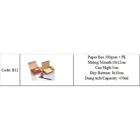 Chất liệu: giấy kraft Định lượng: 300 gsm Màu sắc: nâu trơn ( đậm/nhạt tùy theo lô giấy) Bên trong có tráng 1 lớp PE với công dụng chống thấm Công dụng: đựng cơm, mì/ nui/ phở xào, salad.... Quy cách đóng gói: 50 hộp/ đơn Sản phẩm được kiểm nghiệm an toàn vệ sinh thực phẩm . Bảo quản: nơi khô ráo Chất liệu giấy: 300g Kraft Giấy + 20g Lớp Phủ PE