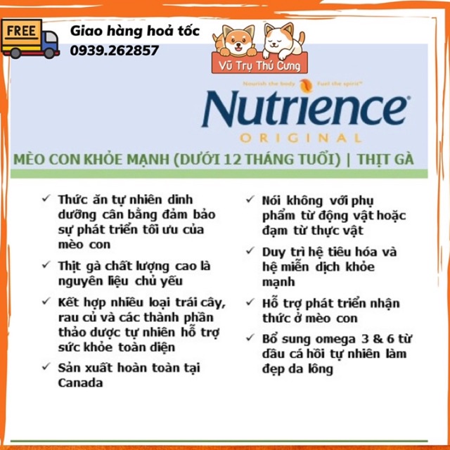 Thức ăn hạt Nutrience Original Healthy Kitten dành cho Mèo con dưới 12 tháng tuổi. Sử dụng bột thịt gà chất lượng cao làm thành phần chủ yếu. Không sử dụng các phụ phẩm từ động vật (meat by-product) hoặc đạm thực vật. Nhằm đảm bảo cho mèo con của bạn phát triển cơ bắp chắc khỏe.