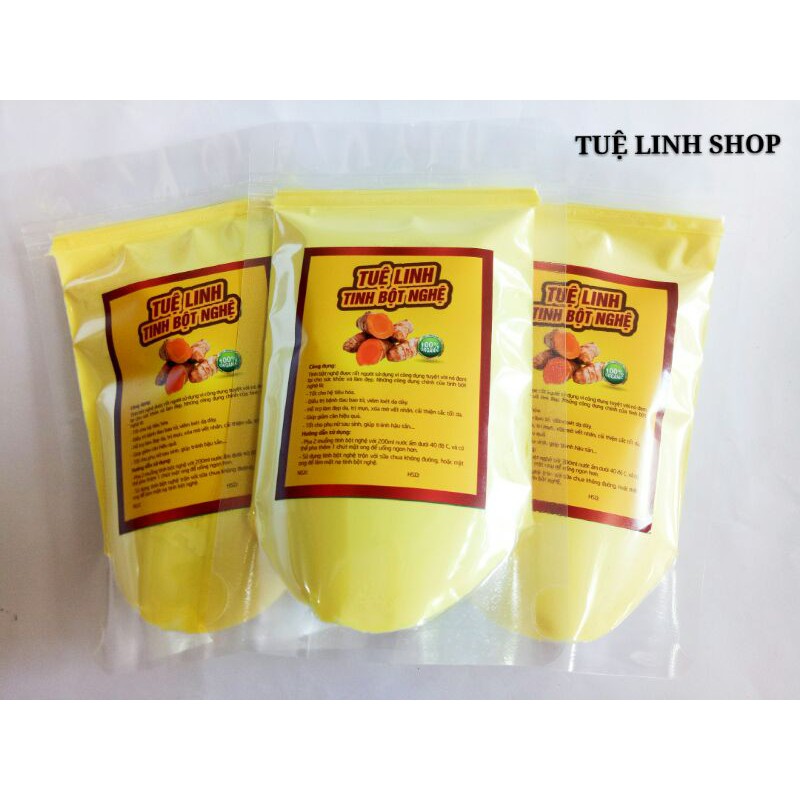 Thông số kỹ thuật, quy trình sản xuất tinh bột nghệ Tuệ Linh: - Tinh bột nghệ là thành phẩm từ củ nghệ tươi, sau khi trải qua quá trình tách lọc, loại bỏ tạp chất, thì đem xay nhuyễn thành bột. Sau đó nghệ được lắng đọng, chưng cất và tách tinh dầu nhiều lần thì sẽ thu được tinh bột nghệ nguyên chất, đảm bảo có chứa hàm lượng curcumin cao. Sau khi đem sấy khô, tinh bột nghệ sẽ có dạng cục, tiếp đến là nghiền mịn chúng nhiều lần để thu được tinh bột nghệ thật mịn và nhuyễn. - Khối lượng: 500 gr - Thành phần: 100% củ nghệ tươi - Ưu điểm nổi bật: Củ nghệ được thu gom từ các tỉnh miền núi phía Bắc, có hàm lượng curcumin tốt nhất . Màu: Vàng tươi * Lưu ý khi sử dụng tinh bột nghệ: - Tuyệt đối không pha với nước nóng >60 độ C (tinh bột nghệ gặp nước nóng >60 độ C sẽ bị vón cục). * Bảo quản tinh bột nghệ Tuệ Minh - Để nơi khô ráo, tránh ánh nắng trực tiếp - Hạn sử dụng : 1 năm kể từ ngày sản xuất (xem trên bao bì) - Xuất sứ: Việt Nam sản phẩm không phải là thuốc không có tác dụng thay thế thuốc chữa bệnh.