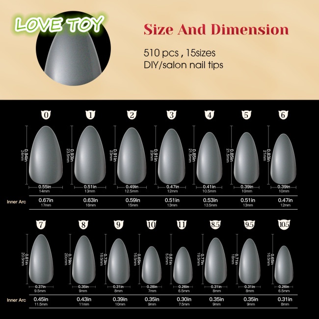 1. Kích thước đa dạng: 510 đầu móng tay giả, bao gồm 14 kích cỡ móng tay khác nhau. Vì vậy, ngay cả khi bạn vô tình kết hợp chúng, bạn có thể nói với họ một cách nhanh chóng.