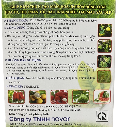 SHOP NÔNG NGHIỆP AN NHIÊN CAM KẾT BÁN HÀNG UY TÍN - Sẵn sàng nhận lại hàng hoàn lại tiền khi khách hàng phản ảnh về chất lượng - Tư vấn hỗ trợ ĐT/Zalo 0989579546 - website: trongrautainha.vn ==================== THÔNG TIN SẢN PHẨM 50g Phân Bón Lá/ Tưới gốc Novar Nutri Zinc Tác dụng cung cấp thêm các dưỡng chất thiết yếu cho Hoa hồng, Cây cảnh, Rau màu, cây ăn trái.... Xuất xứ: Thái Lan Đơn vị nhập khẩu và đóng gói: Công ty TNHH Novar ĐC: Lô C2, Cụm CN Thọ Xương, P. Thọ Xương, Tp Bắc Giang. Quyết định lưu hành sản phẩm số 3350/QĐ-BVTV-PB. Mã số phân bón: 05886 Hạn sử dụng: 3 năm kể từ ngày sản xuất Bảo quản nơi thoáng mát, tránh xa tầm tay trẻ em. =================== THÀNH PHẦN: - Kẽm Zn: 130.000ppm - Mangan Mn: 20.000ppm - Sulfur (S): 8% - Magie (Mg): 4,8% - Phụ gia đặc biệt bổ sung trung và vi lượng khác. ==================== CÔNG DỤNG: ✔Bổ sung vi lượng Zn-Mn (Thành phần chính của Man Xanh (Mancozeb) giúp ngăn ngừa các hiện tượng nhỏ lá, nhỏ trái, vàng phần trung tâm của lá, ra chồi không đồng đều, chậm ra hoa, gân lá vàng và ngắn cây. ✔ Cải thiện hiện tượng Vàng gân lá, xoăn lá, bạc lá, rụng lá, thối nhũ hoa, teo trái, chàm trái, nám quả do thiếu hụt Zn ✔ Kích thích sự tổng hợp các chất diệp lục cũng như các quá trình sinh lý khác như tổng hợp các chất dinh dưỡng. ==================== HƯỚNG DẪN SỬ DỤNG - Thích hợp cho hệ thống tưới tự động hoặc phun qua lá. - Pha 5g/20 lít nước. Phun đều trên lá hoặc pha tưới trực tiếp xuống đất. Đối với vườn ruộng cây trồng có biểu hiện thiếu trung vi lượng thì phun/ tưới 7-10 ngày/lần. Đối với vườn ruộng cây trồng không có biểu hiện thiếu trung vi lượng thì phun/ tưới 20-30 ngày/lần. #sieubatmam #xanhla #combi #phanhoahong #nhieuhoa #batchoi #phanviluong #phantrungviluong #phanviluong #manxanh #Mancozeb