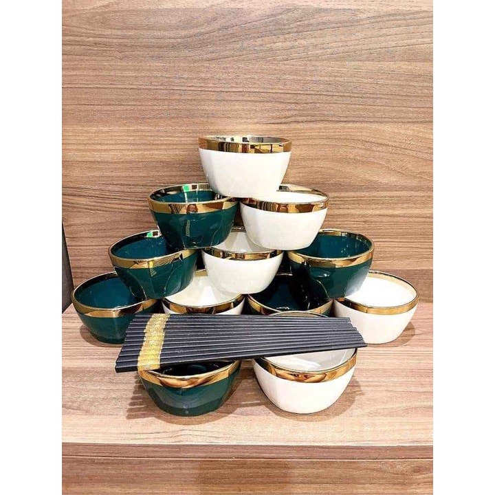 - Bộ chén đũa cao cấp gồm 6 chén 6 đũa cao cấp sang trọng có hộp làm quà tặng, phù hợp với các ngày tri ân, sự kiện tân gia, ngày lễ,... - Bộ sản phẩm có 2 màu, màu trắng và màu xanh nên khi mua bạn nhớ chọn đúng phân loại màu bạn nhé. Bộ sản phẩm bao gồm: + 6 chén màu: Màu xanh hoặc màu trắng. - Chiều cao chén: 6cm - Đường kính chén: 11cm - Chén viền vàng được làm từ chất liệu gốm sứ cao cấp, tráng men sáng bóng, không chứa chì, không độc hại, tuyệt đối an toàn cho sức khỏe người sử dụng. + 6 đôi đũa khảm sang trọng. .+ Hộp ở ngoài làm quà tặng cho khách hàng, cho bạn bè, đối tác. Để cho không gian bếp, bàn ăn của gia đình thêm sự sang trọng, cao cấp thì bộ chép đũa tráng men cao cấp sẽ phù hợp với chọn lựa cho gia đình bạn.