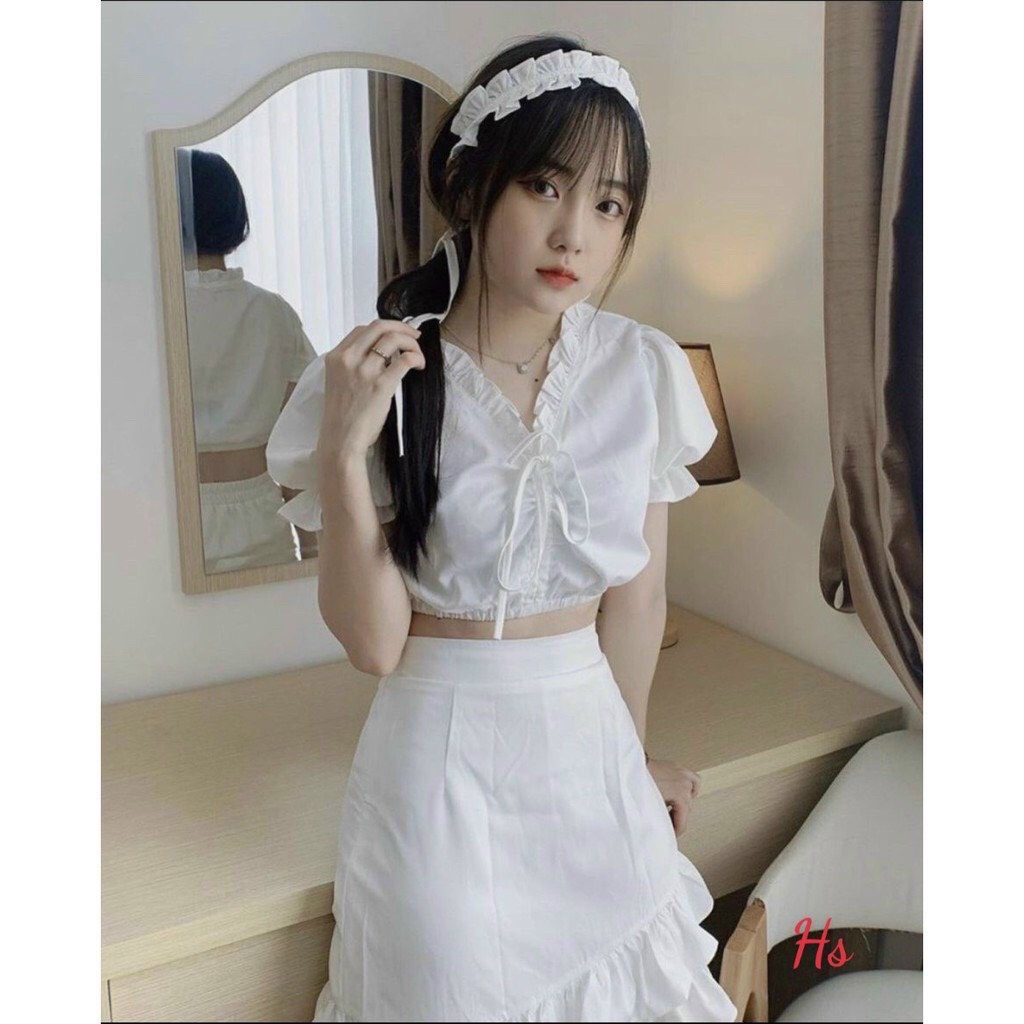Giới thiệu [8.8 Sales Freeship] Set váy trắng tiểu thư, set áo croptop rút ngực tay búp mix chân váy ngắn bèo kèm băng đô dx