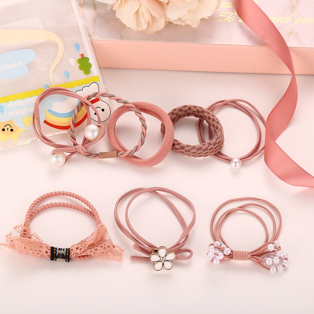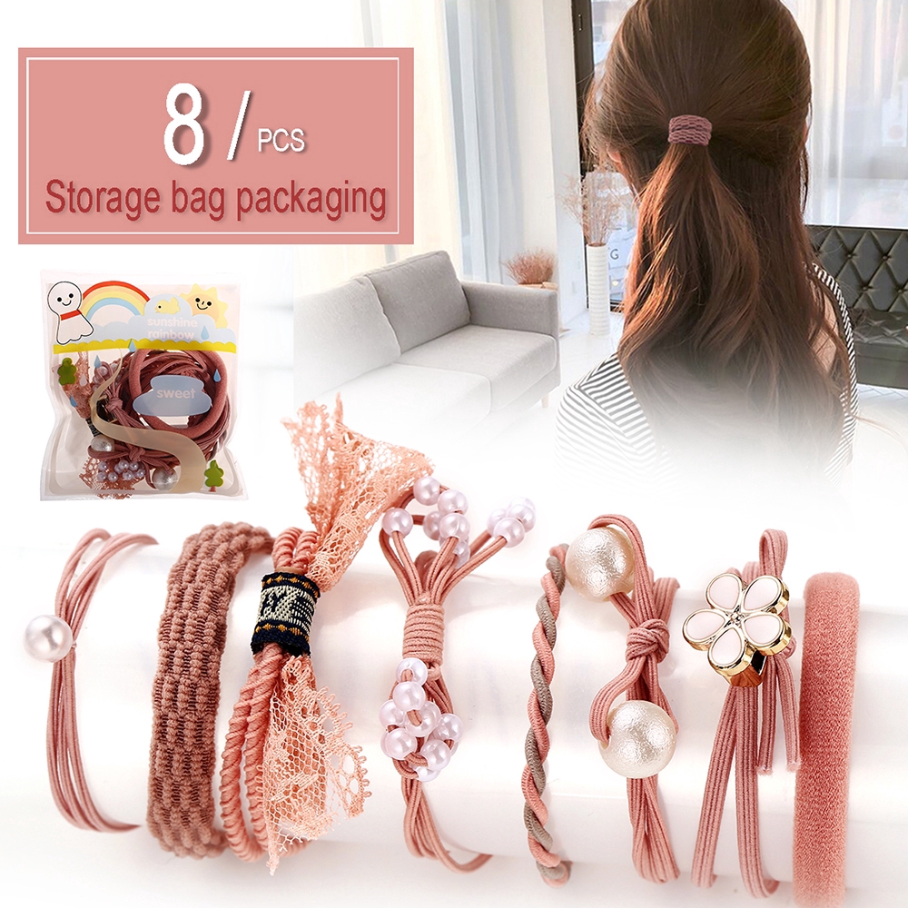Giới thiệu Bộ 8 dây cột tóc 17KM màu hồng phối ren hoa và ngọc trai xinh xắn