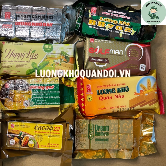 Combo gồm có 8 loại lương khô sau : Lương khô mặn cao cấp 70gr Bay 100g Dream business cao cấp bổ sung thêm 3 loại hạt dinh dưỡng macca, óc chó, yến mạch 70g Lk ăn kiêng happy life 70g Lk vừng đen hương quê 70g Lương khô cacao 70g Lk BB 702 70g Lk goflman mềm giàu dinh dưỡng 70g lương khô vị mặn lương khô quân nhu vị đậu xanh Hsd8 tháng - 1 năm kể từ ngày sản xuất0