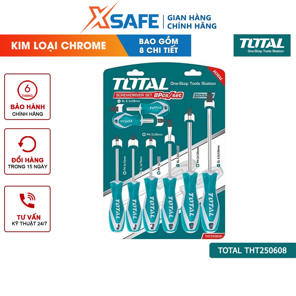 BỘ 8 TUA VÍT TOTAL THT250608 Được nhập khẩu và phân phối chính hãng bởi Xsafe ------------------ 👉🏻 GIỚI THIỆU BỘ 8 TUA VÍT TOTAL THT250608 Bộ tuốc nơ vít Total THT250608 đây thật sự là bộ dụng cụ cầm tay đa năng chuyên dùng để vặn/mở ốc vít, gồm có 8 cây (4 vít dẹp và 4 vít bake). Tuốc nơ vít thì được làm từ chất liệu hợp kìm thép chrome - vanadium nên có độ cứng cao và cũng sẽ không bị mài mòn và gỉ sét theo thời gian, phần tay cầm thì được làm từ nhựa mềm và có bọc lớp cao su nên sẽ mang lại cảm giác êm ái khi cằm nấm sử dụng, hạn chế trơn trượt khi chẳng may tay bị ướt, bộ sản phẩm này có tính ứng dụng cao trong nhiều ngàng nghề như: lắp đặt, sửa chữa và bảo dưỡng...