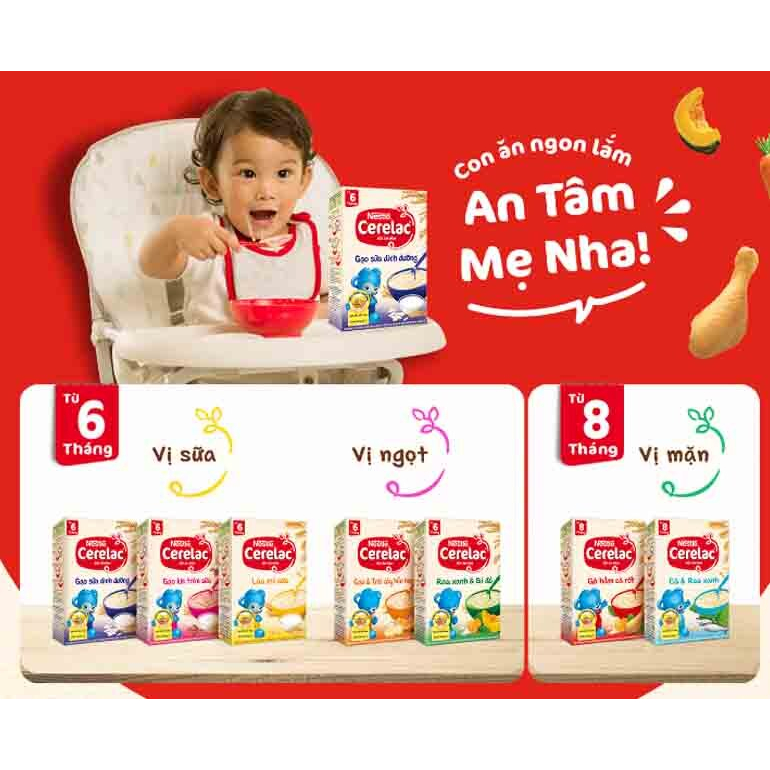 -------------------------- - Độ tuổi: 6 tháng trở lên - Khối lượng tịnh: 200gr - Xuất xứ: Maylaysia. Hướng dẫn sử dung: - Rắc từ từ 50gram bột ăn dặm (tương đương 5 muỗng canh) vào chén có 150ml nước ấm (tầm 40-50 độ), khuấy đều theo 1 chiều cho đến khi bột tan hoàn toàn. ------------------------ - Có thể kết hợp rau củ, trái cây, thịt…hấp / luộc tán nhuyễn cùng chén bột ăn dặm Nestlé CERELAC Gạo Sữa Dinh Dưỡng đã pha. - Có thể nấu canh / súp với rau củ, thịt cá…sau đó, chờ nước nguội (tầm 40 – 50 độ) rồi rắc từ từ bột ăn dặm Nestlé CERELAC Gạo Sữa Dinh Dưỡng vào với lượng tương ứng rồi khuấy đều theo 1 chiều cho bột tan Bảo quản: - Bảo quản sản phẩm nơi khô ráo, thoáng mát. - Sau mỗi lần sử dụng, gấp chặt phần trên của lớp giấy bọc nhôm và bảo quản trong lọ đậy kín nắp, để nơi khô ráo.- Nên sử dụng hết sản phẩm trong vòng 6 tuần sau khi mở hộp.