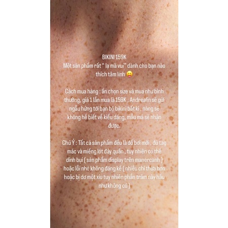 nàng chọn size theo danh mục và hãng sẽ gửi đúng size ạ [ BIKINI 199K sẽ là sp mới hơn, hầu như nằm trong BST mới, ko có lỗi , chỉ bị dơ một xíu xiu giặt ra nhanh , nếu sản phẩm đó không nằm trong BST mới thì sẽ là sản phẩm mẫu cũ nhưng không lỗi, có thể dơ nhẹ, không bị sao đáng kể luôn ạ. )