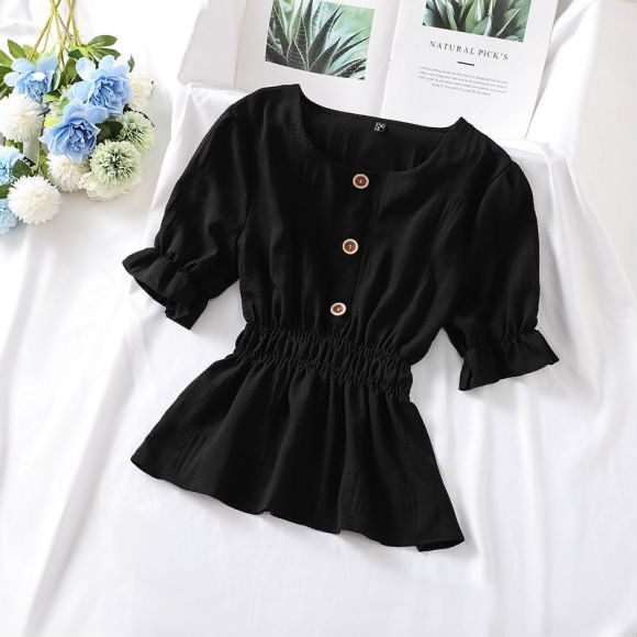 Phiên bản áo: Vừa vặn Thông tin chi tiết kiểu áo: Xếp ly, hàng cúc, màu trơn Cách mặc: Chui đầu Chiều dài / Chiều dài tay: Tay áo thường / ngắn Kiểu cổ: Cổ tròn Chất vải: Vải voan / polyester Thời gian ra mắt sản phẩm: Mùa hè năm 2021