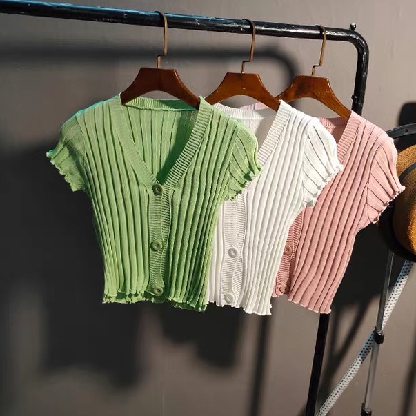 Giới thiệu Áo croptop dệt kim nữ cổ V tay ngắn trẻ trung hàng Quảng Châu cao cấp