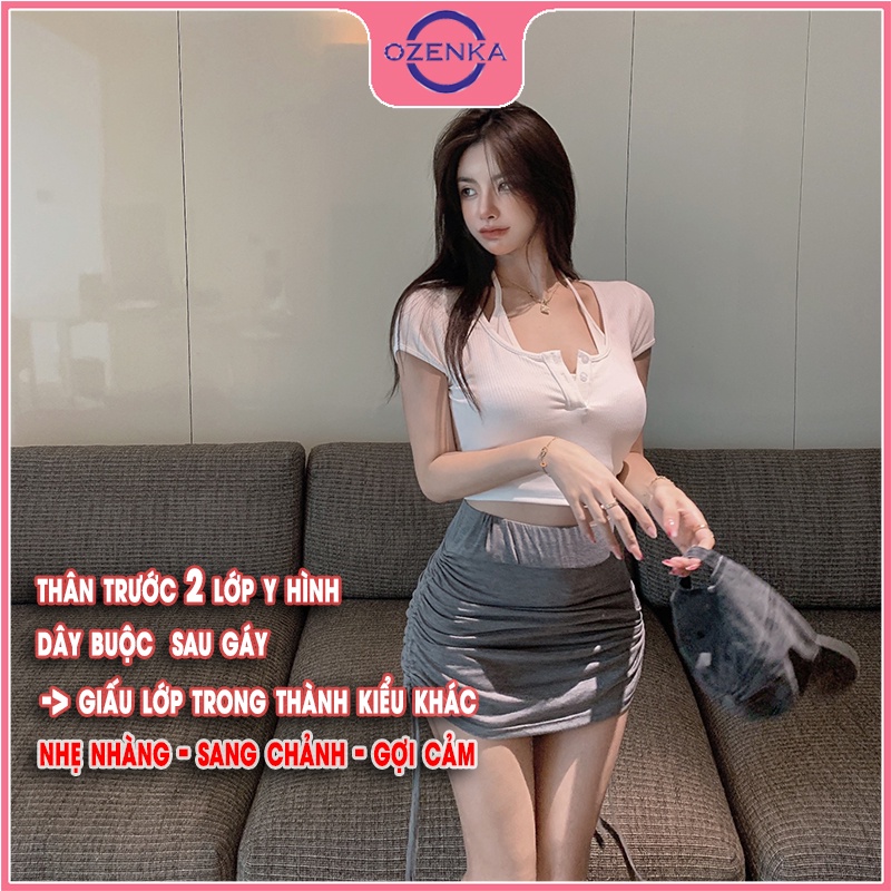 Giới thiệu Áo croptop nữ kiểu hàn quốc cổ yếm 2 lớp OZENKA , áo phông crt ôm body cài khuy cotton 100% màu đen trắng dưới 55 kg