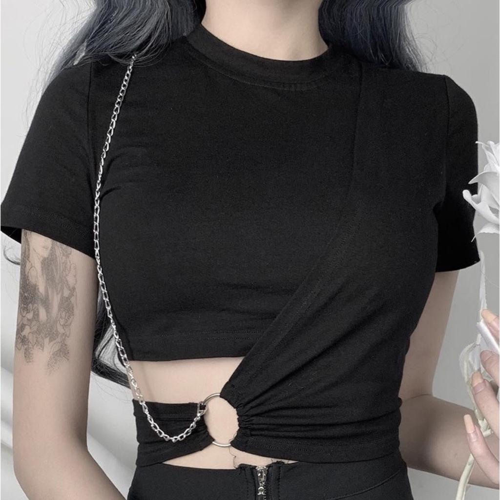 Giới thiệu Áo croptop nữ ngắn tay phối khoen kèm xích Xquin, Áo kiểu nữ cổ tròn khoét eo cực tôn dáng