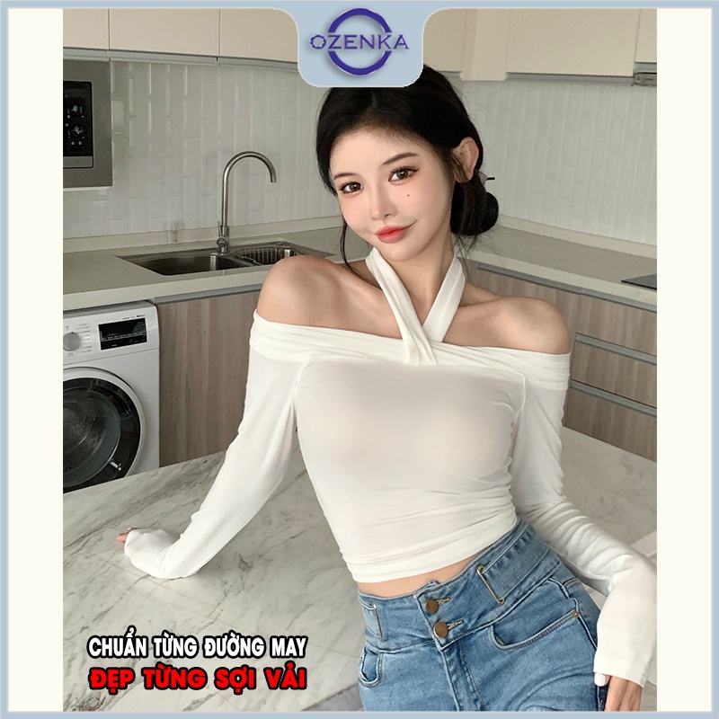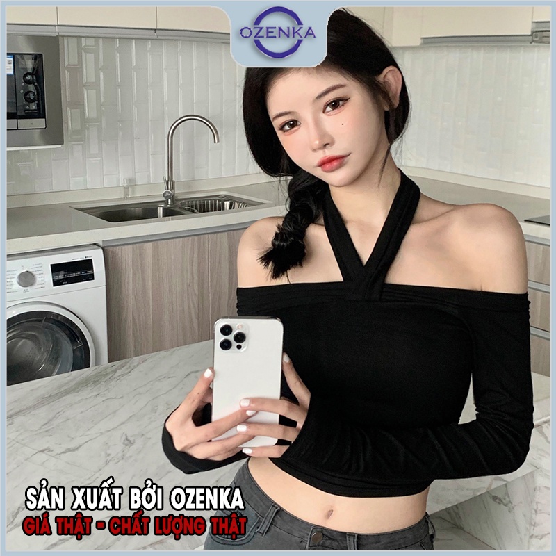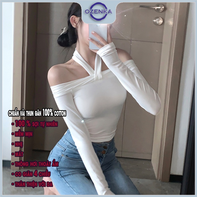 Áo croptop nữ tay dài trễ vai cổ v OZENKA , áo crt ôm body thun 100% cotton màu đen trắng gợi cảm dưới 55 kg