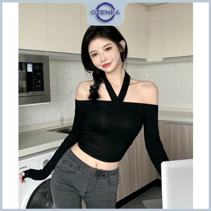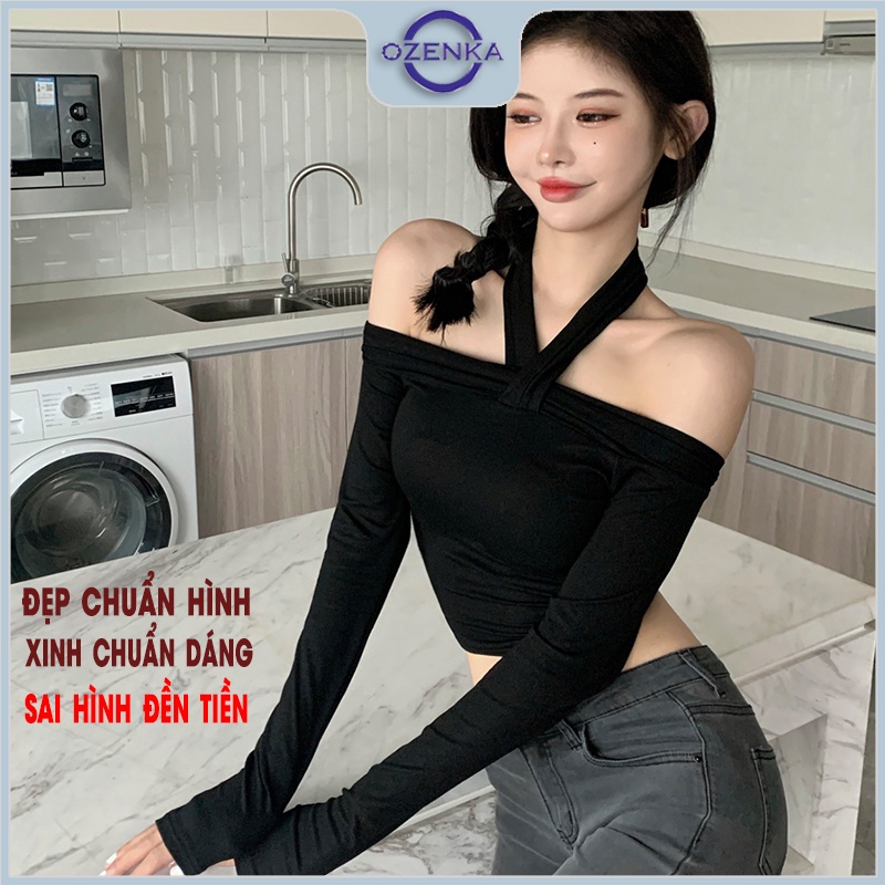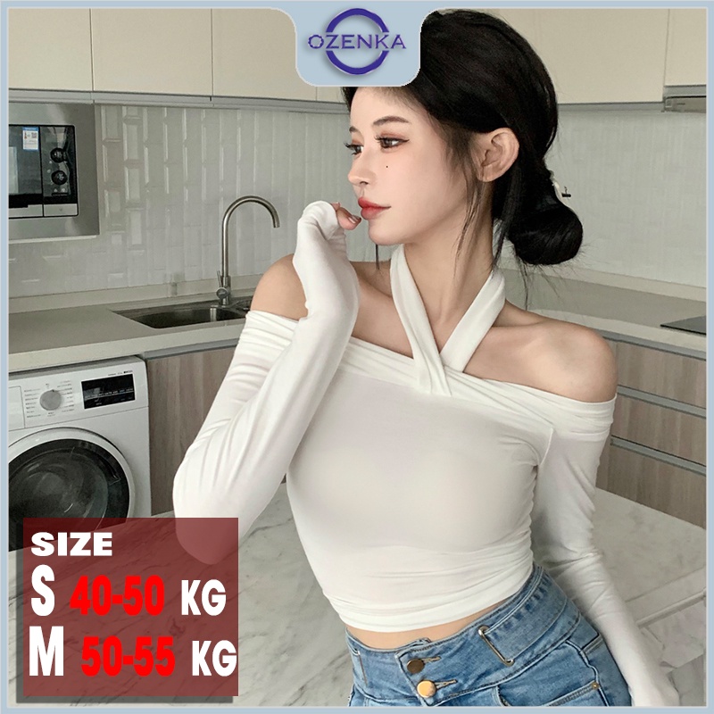 Giới thiệu Áo croptop nữ tay dài trễ vai cổ v OZENKA , áo crt ôm body thun 100% cotton màu đen trắng gợi cảm dưới 55 kg