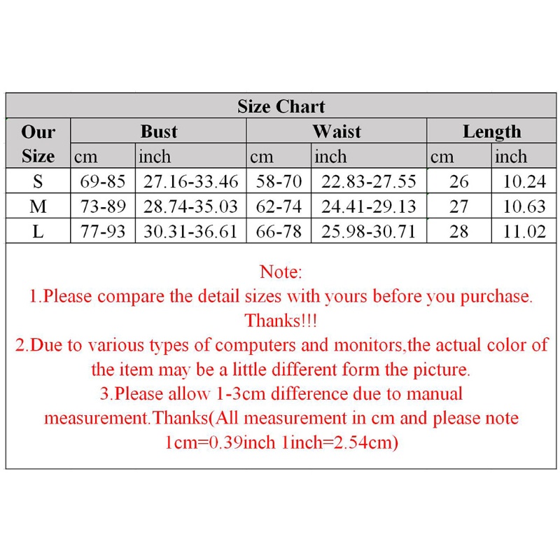 Thông tin chi tiết: Chất liệu: Cotton Màu sắc: Như hình ảnh hiển thị. Kích thước: S / M / L (Kích thước Trung Quốc, vui lòng chọn size dựa trên bảng kích thước) Kích thước: S Ngực: 69cm-85cm (27.16inch-33.46inch) Eo: 58cm-70cm (22.83inch-27.55inch) Chiều dài: 26cm (10.23inch) Kích thước: M Ngực: 73cm-89cm (28.74inch-35.03inch) Eo: 62cm-74cm (24.41inch-29.13inch) Chiều dài: 27cm (10.62inch) Kích thước: L Ngực: 77cm-93cm (30,31 inch-36,61 inch) Eo: 66cm-78cm (25,98 inch-30,71 inch) Chiều dài: 28cm (11,02 inch) Số lượng: 1 cái