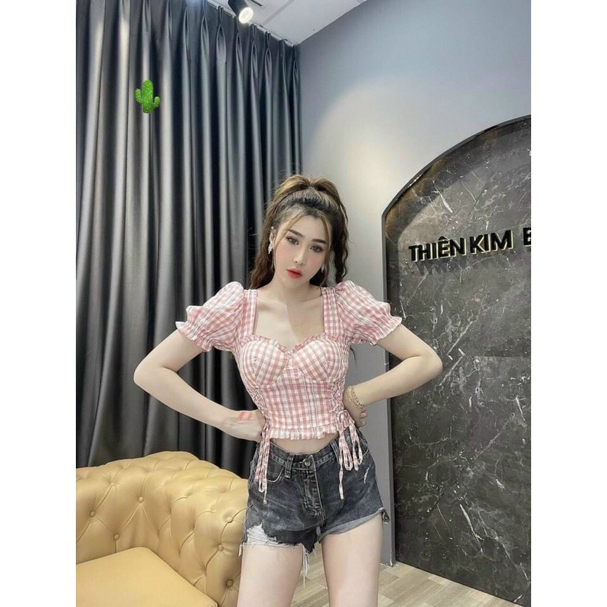 Giới thiệu Áo croptop tay ngắn caro rút dây 2 bên cực xinh , chất kate lụa mềm mịn ( ảnh thật )