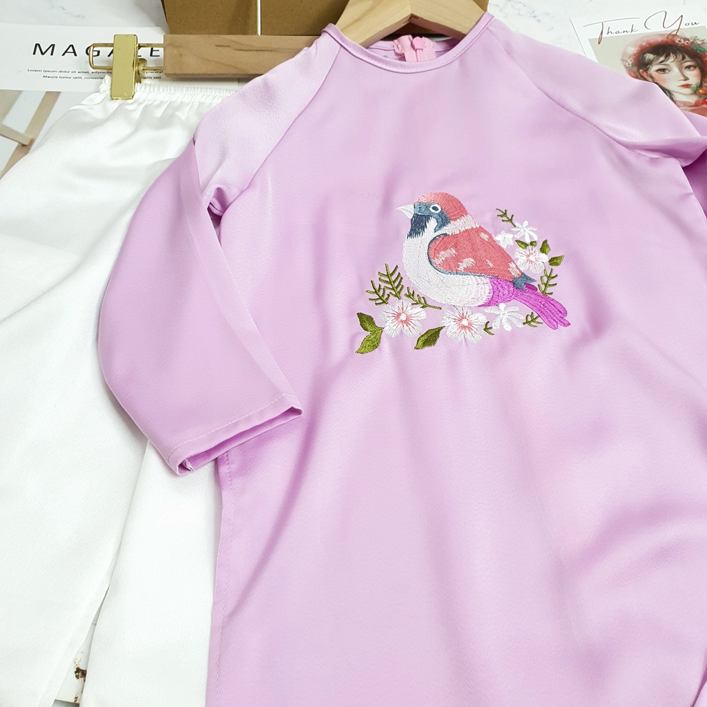 Giới thiệu Áo Dài Bé Gái Vải Lụa Mát Lịm Thêu Chim Hoa Quế Chi Tím Hồng